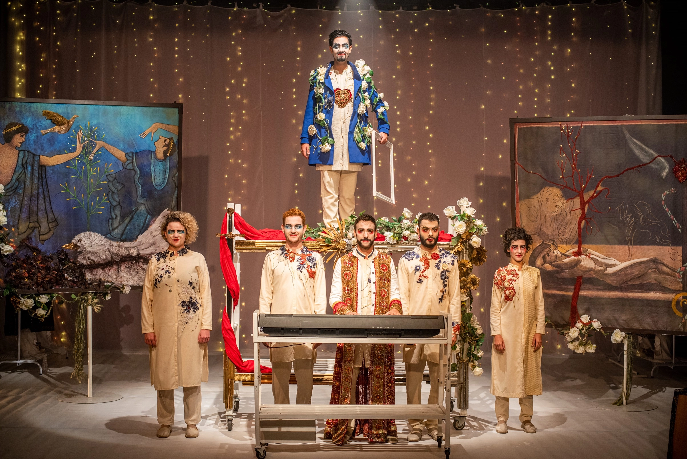 Os Geraldos és un grup fundat el 2008 i actualment compta amb una vintena de membres que desenvolupen un llenguatge popular basat sobretot en les visualitats de l’espectacle i l’expressivitat vocal, amb escenes predominantment musicals i plàstiques. Aquesta serà la primera vegada que actuen a Europa, i ho faran a la Casa del Teatre Nu, amb un espectacle escènico-musical basat en les tradicions orals entorn el “sarao” brasiler del ritual funerari per acomiadar a vells artistes. El “sarao fúnebre” és una tradició centenària que també es manifesta a motes com “el Boto y la Velada” de Parintins, a Amazones (Brasil). La història de l’obra sorgeix d’una trobada entre artistes d’un grup de teatre, per homenatjar i recordar moments viscuts amb un company que ha mort accidentalment. Aquest fet els porta a buscar el sentit de l’existència, trobant-lo dins les possibilitats de la creació artística.