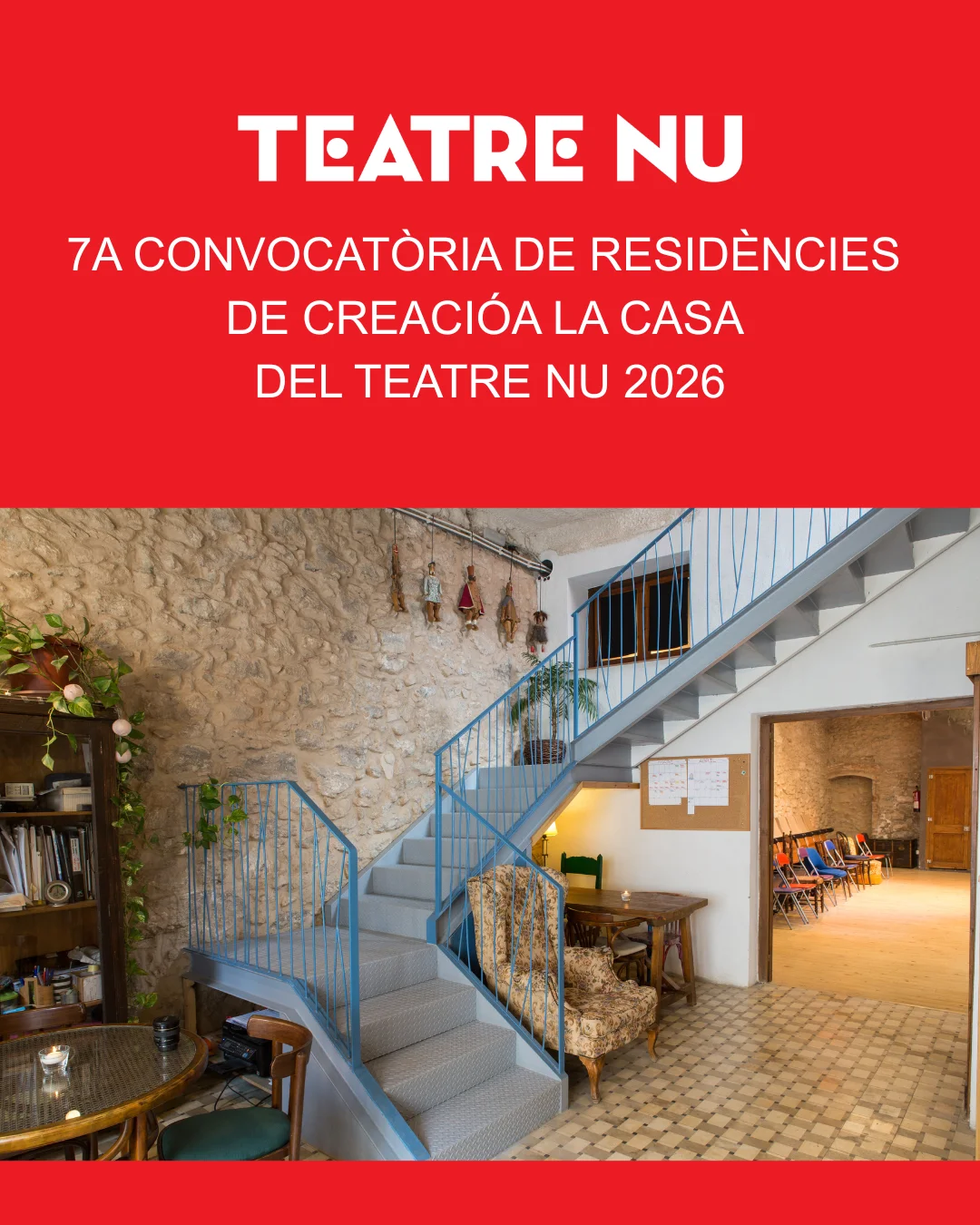 Les residències artístiques són un dels eixos fonamentals del projecte de Teatre Nu. Des del 2021, acompanyem processos creatius de companyies i artistes, oferint espais d’assaig i producció en un entorn proper i compartit. Teatre Nu disposa de quatre pisos de residència —Pis de la Portera, Pis de la Sogra, Pis de la Tieta i Ca l’Amadeu— i d’espais comuns com la Sala Blanca, la Sala Negra i el Teatre, que faciliten la creació i l’intercanvi.